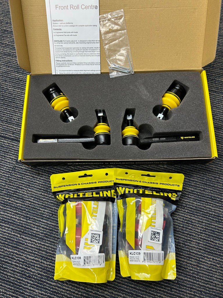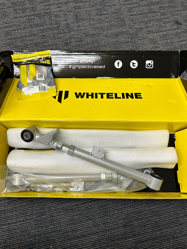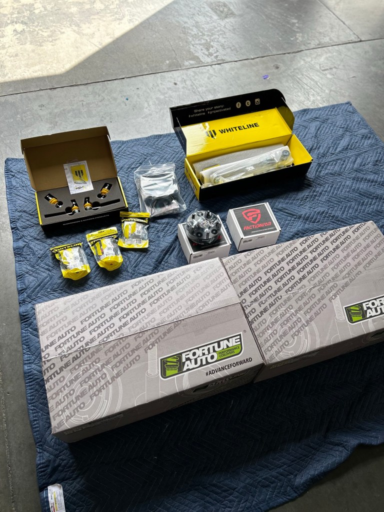 I’ve been slowly accumulating parts for the suspension overhaul. I knew I made a mistake when it came to going air suspension but I’m correcting the wrongs now. Picked up almost the entire Whiteline catalog, 25mm spacers, and Fortune Auto coilovers and a air cup setup.