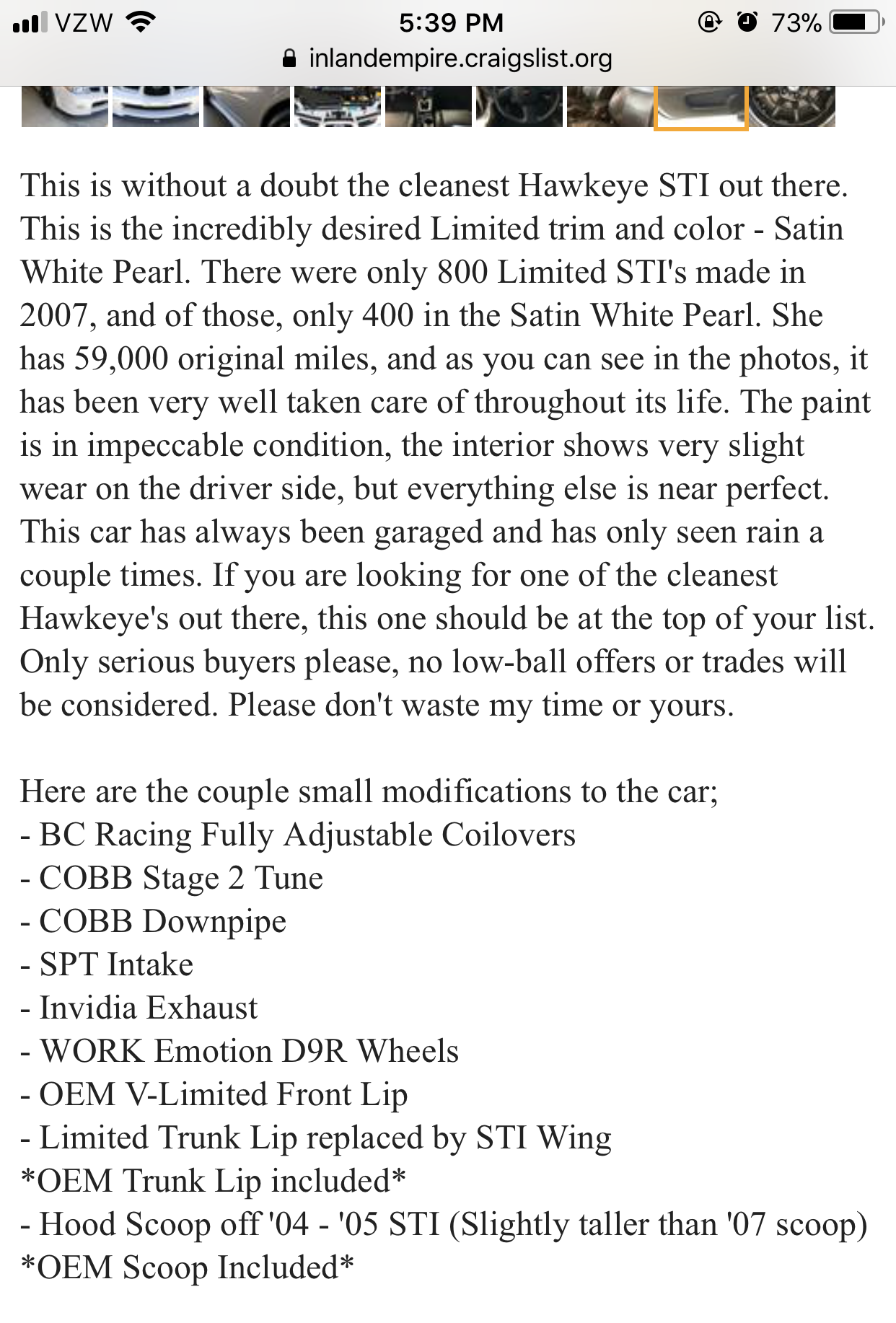 This was the first photo I ever took of the STI and I attached the original Craigslist ad for the car. There was nothing out of the ordinary on the ad and the modifications done to the car were all relatively “safe” mods for me.