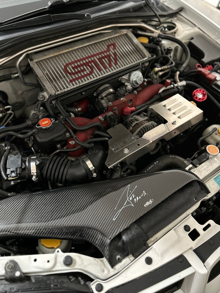 Eventually I will relocate the battery to the trunk and I am wanting to get the Prova Eifel CF intake scoop sprayed with another layer of clear coat to preserve the signature from Toshihiro Yoshida, President of PROVA! Once that is complete, I’ll be pretty happy with the bay!